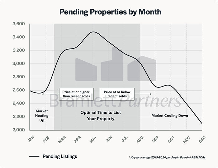 The Austin Metro is consistently very seasonal. There are almost twice as many homes put under contract during the peak spring months than during the holidays. It's a hassle to move during the holidays so most buyers choose not to. Many buyers have school age children and prefer to move during the summer so they choose to close in time to move and get settled before school starts. It's important to remember that a closing occurs 30-45 days after you go under contract so you likely want to list sooner than you might expect.
